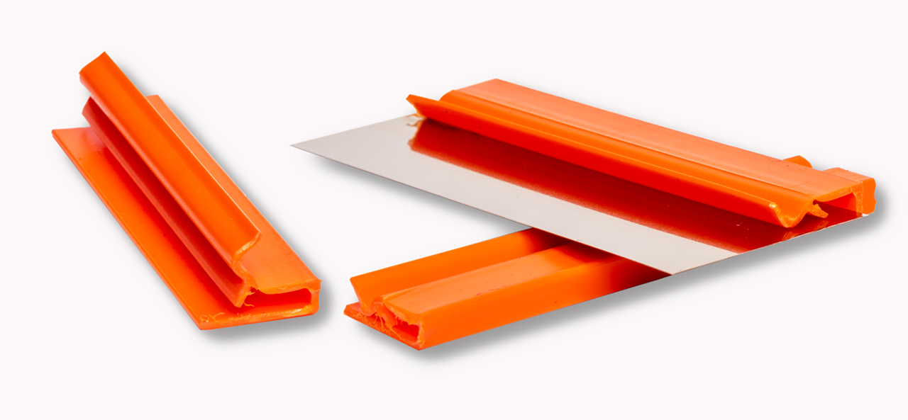 Die aufklappbare Schiene schützt den Anwender vor Schnittverletzungen und die Rakel vor Beschädigungen und Schmutz.